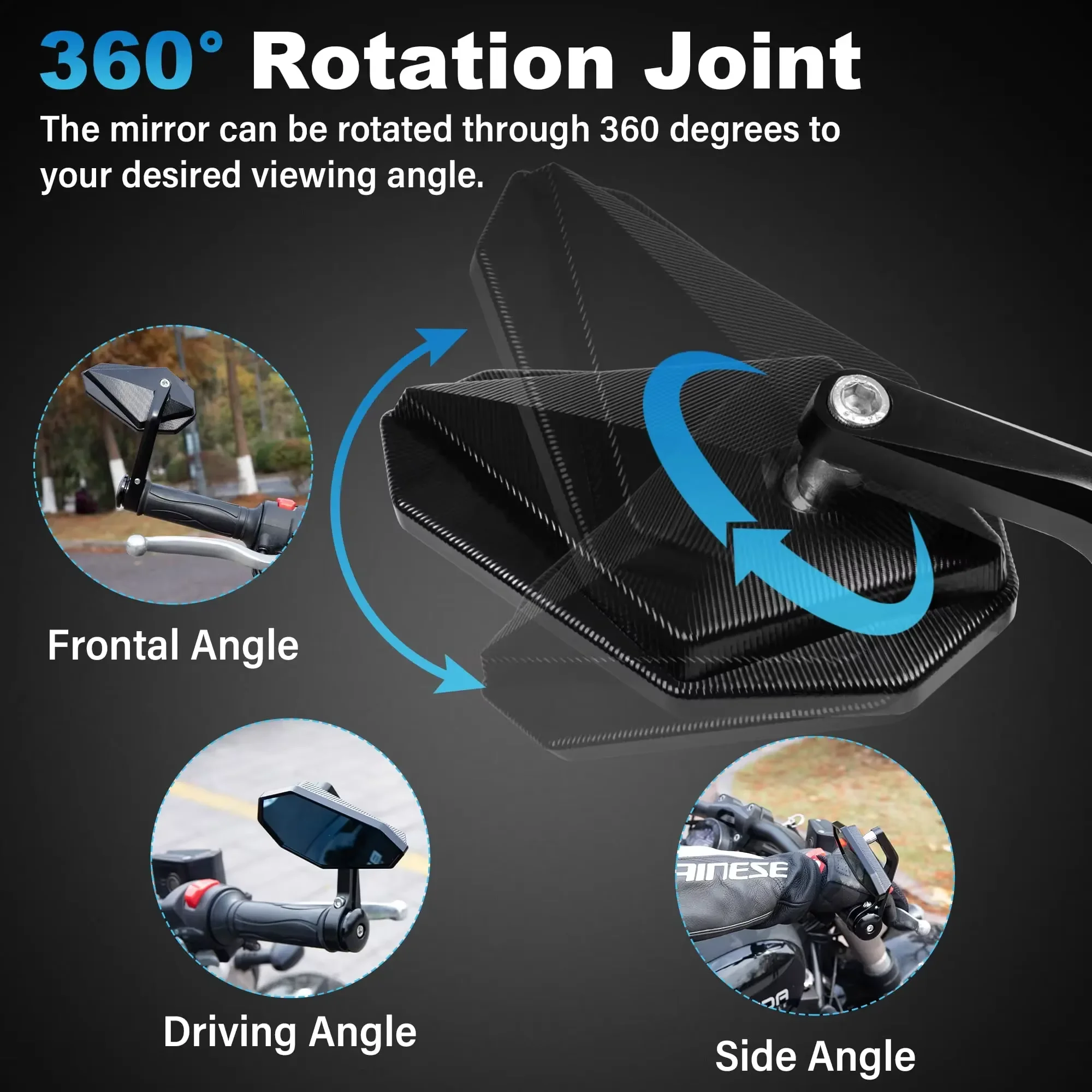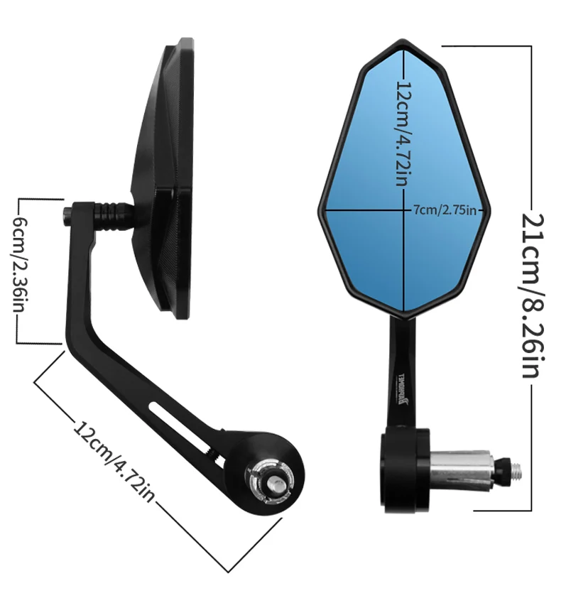 الملاءمة والراحة: تم تصميمه مع أ مفصل دوران 360 درجةمما يسمح للراكب بضبط المرآة على زاوية الرؤية المرغوبة بما في ذلك الزوايا الأمامية والقيادة والجانبية. يضمن نظام مسمار التوسيع العالمي ملاءمة آمنة للمقود القياسي مقاس 7/8 بوصة (22 مم).