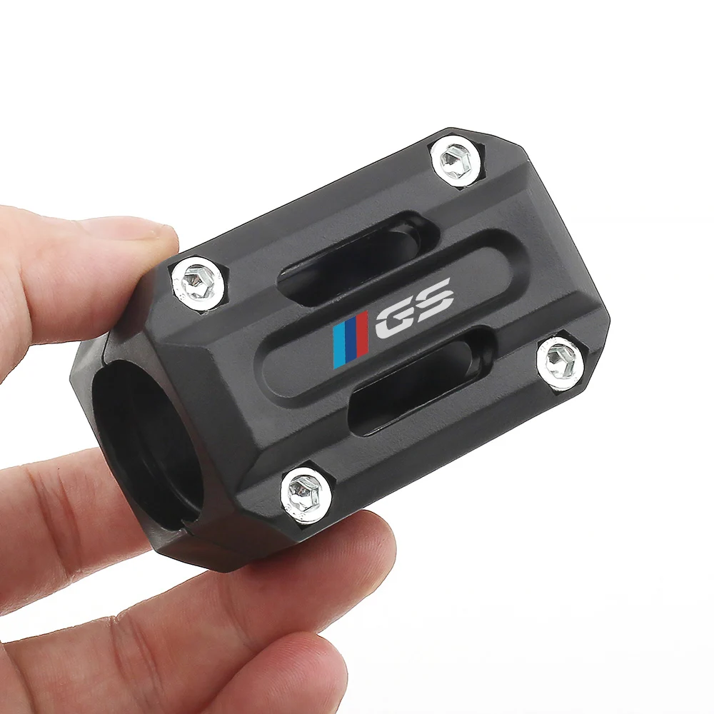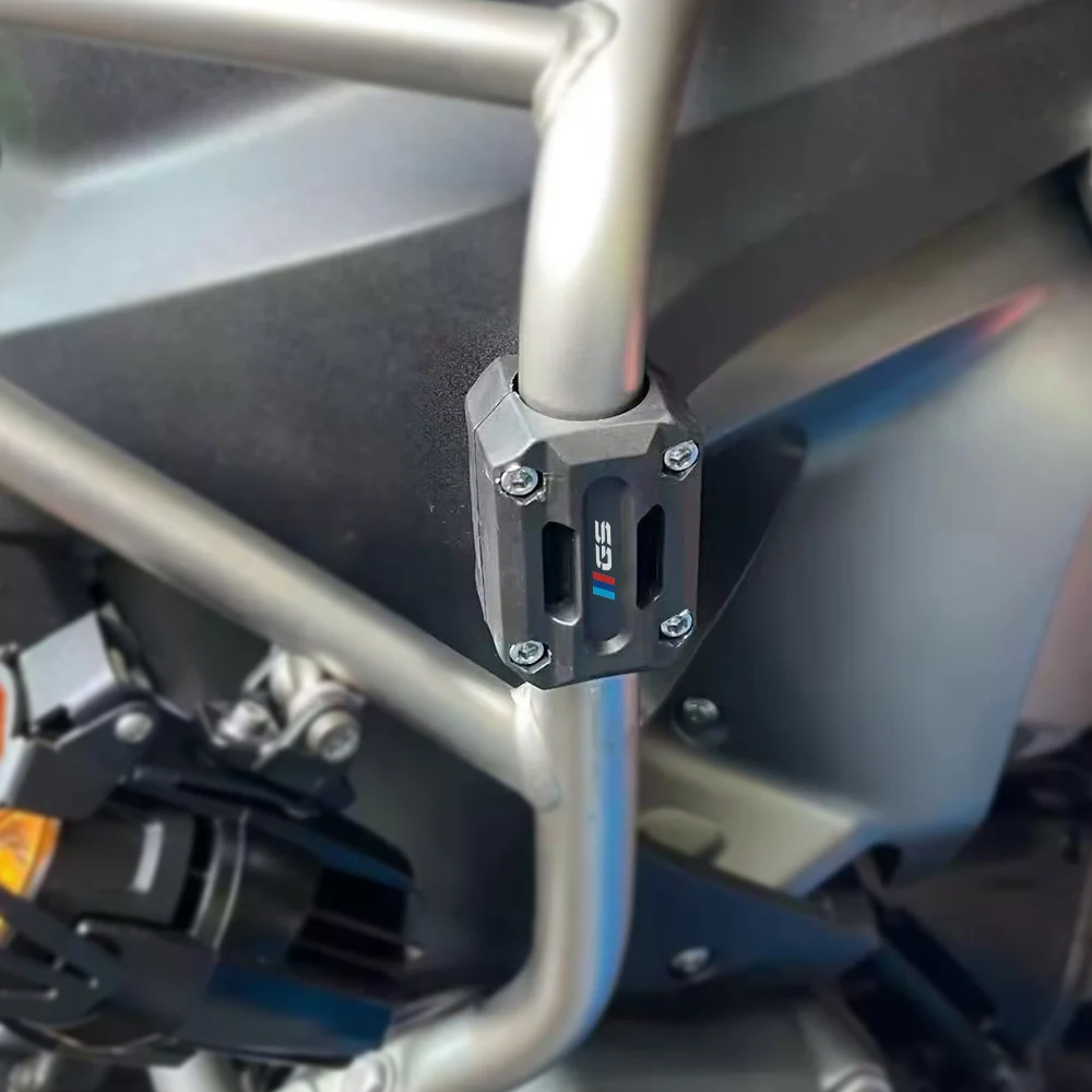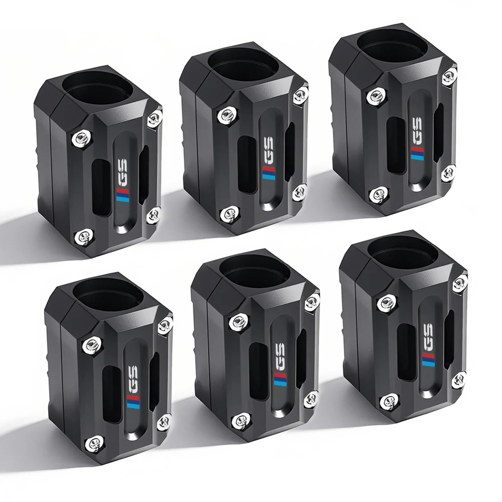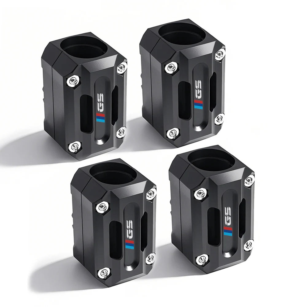Protect your motorcycle's crucial components with the Universal Motorcycle Frame Bumper Guards. These durable, hexagonal protective sliders are designed to mount securely onto your existing crash bars, engine guards, or frame bumpers. Crafted from robust black material, each guard features the prominent GS logo and a small M-Sport color bar (blue and red), blending high-performance protection with iconic adventure branding.
