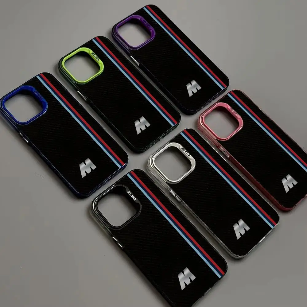 This product is a premium smartphone case featuring a high-tech carbon fiber texture and iconic tri-color racing stripes. This case is the perfect accessory for automotive enthusiasts and tech-savvy individuals looking for a blend of high-performance styling and daily device protection.