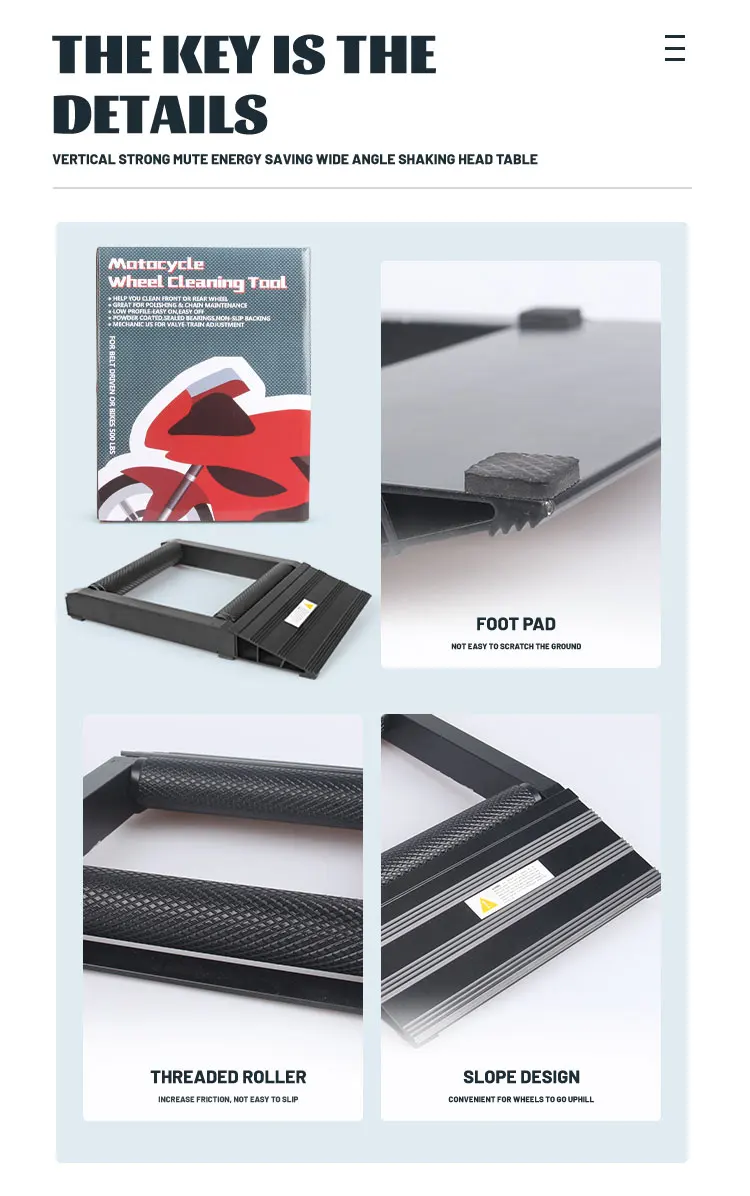 El soporte para limpieza de ruedas de motocicleta es esencial para cualquiera que busque mantener su bicicleta sin el esfuerzo físico de mover todo el vehículo. el rodillos dobles integrados le permite girar la rueda libremente con una mano, mientras que la base estable Garantiza que la bicicleta permanezca erguida y segura. con su diseño portátil y su gran capacidad de peso, esta herramienta ofrece comodidad de nivel profesional para tareas de mantenimiento de rutina, desde pulir llantas hasta comprobar el desgaste de los neumáticos.