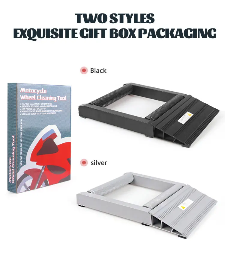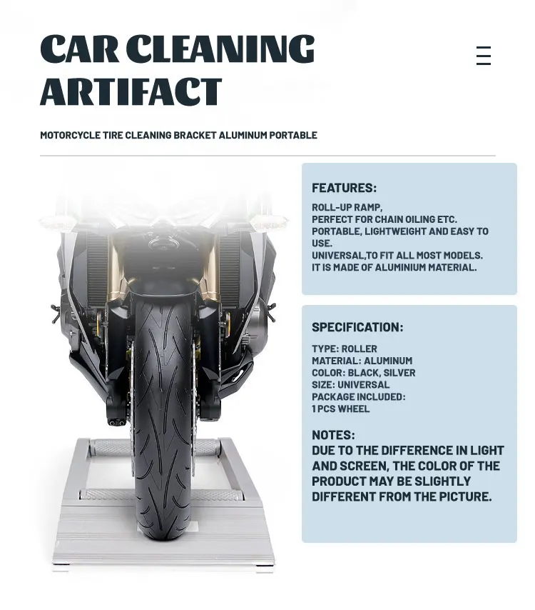 Este producto es un herramienta profesional de limpieza de ruedas de motocicleta Diseñado para simplificar el mantenimiento y los detalles de los neumáticos tanto para entusiastas como para mecánicos. Este soporte con ruedas portátil permite girar las ruedas sin esfuerzo, lo que lo convierte en el accesorio perfecto para propietarios de motocicletas que valoran la precisión y la facilidad durante la limpieza o la lubricación de la cadena.