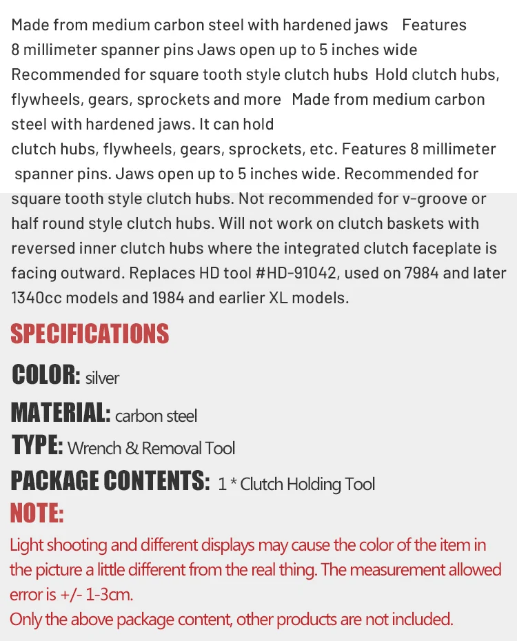 Demande : Spécialement conçu pour maintien des moyeux d'embrayage, volants d'inertie, engrenages et stators sur la plupart des motos et VTT, empêchant la rotation lors du retrait ou de l'installation des écrous de fixation.