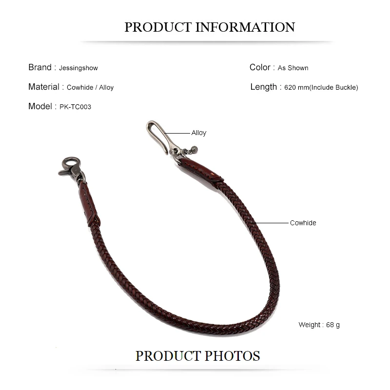 Realizzata con materiali di alta qualità, questa catena da motociclista offre lunga durata e resistenza all'usura quotidiana. Le sezioni in pelle rinforzata garantiscono resistenza nei punti di connessione, mentre la catena in metallo offre una sensazione affidabile e sicura. Facile da usare e comodo da indossare, si integra facilmente in jeans, pantaloni da equitazione o abiti casual.