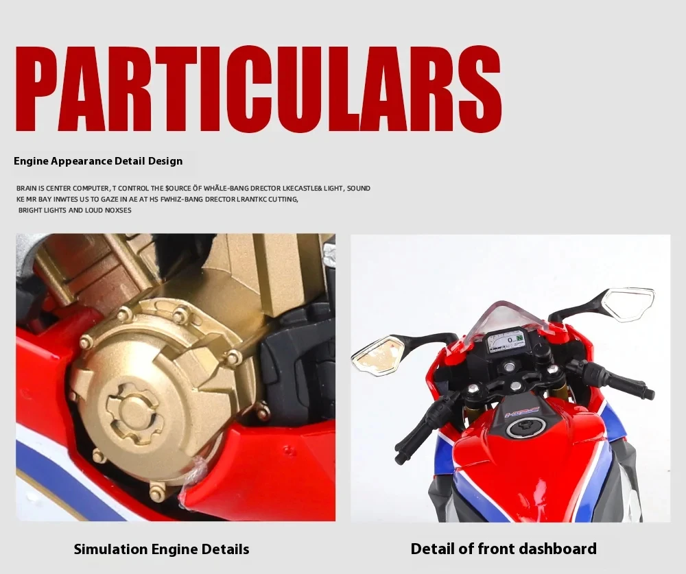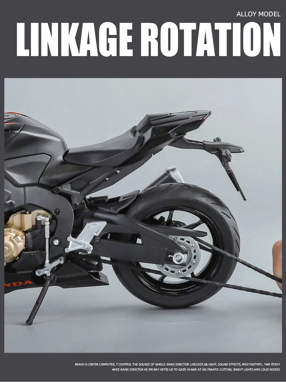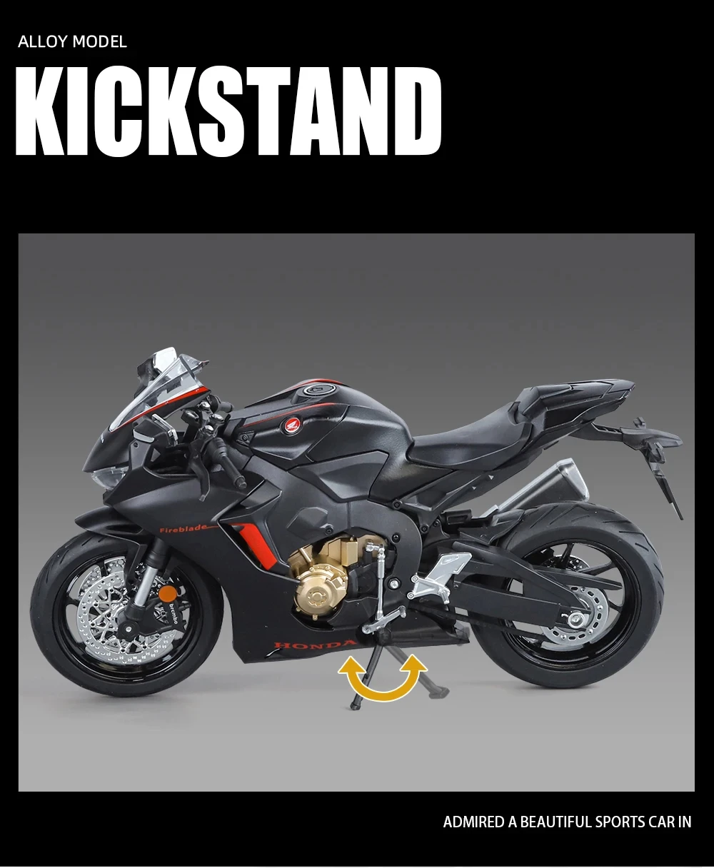 Experience the thrill of speed in scale with the CBR1000RR Fire Blade Alloy Sport Motorcycle 1:9. Every detail has been carefully recreated to offer a realistic experience, from the aerodynamic design to the shock-absorbing linkage that allows smooth, natural movement.