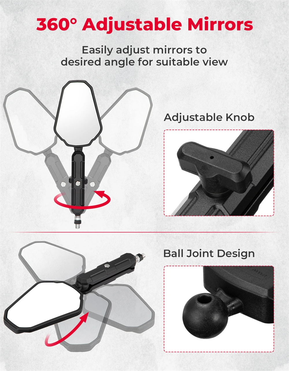 360° Adjustable Design – Ball joint system for easy angle adjustments to achieve the best rearview visibility.