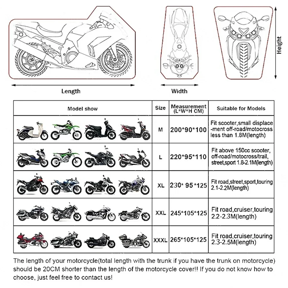 Protect your motorcycle from the elements and keep it safe with this heavy-duty waterproof cover. Built from durable, weather-resistant material, it shields your bike against rain, sun, dust, and snow while ensuring long-lasting protection. Featuring anti-theft lock holes and strong buckle straps, this cover provides not only weather defense but also enhanced security.