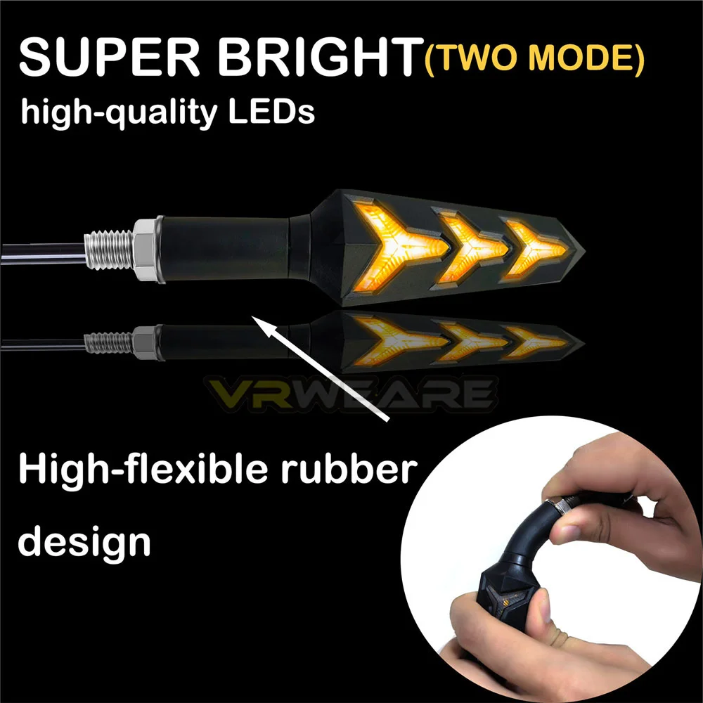 Take your motorcycle lighting to the next level with these waterproof LED turn signal lights. Featuring a bold arrow-shaped LED design, they deliver sharp illumination that enhances both visibility and style. Built with a flexible rubber stem, they are impact-resistant and highly durable, adapting to road vibrations and minor impacts without breaking. Fully waterproof, these signals perform reliably in rain, mud, and all-weather conditions, making them the perfect upgrade for safety-conscious riders who also want modern, eye-catching style.