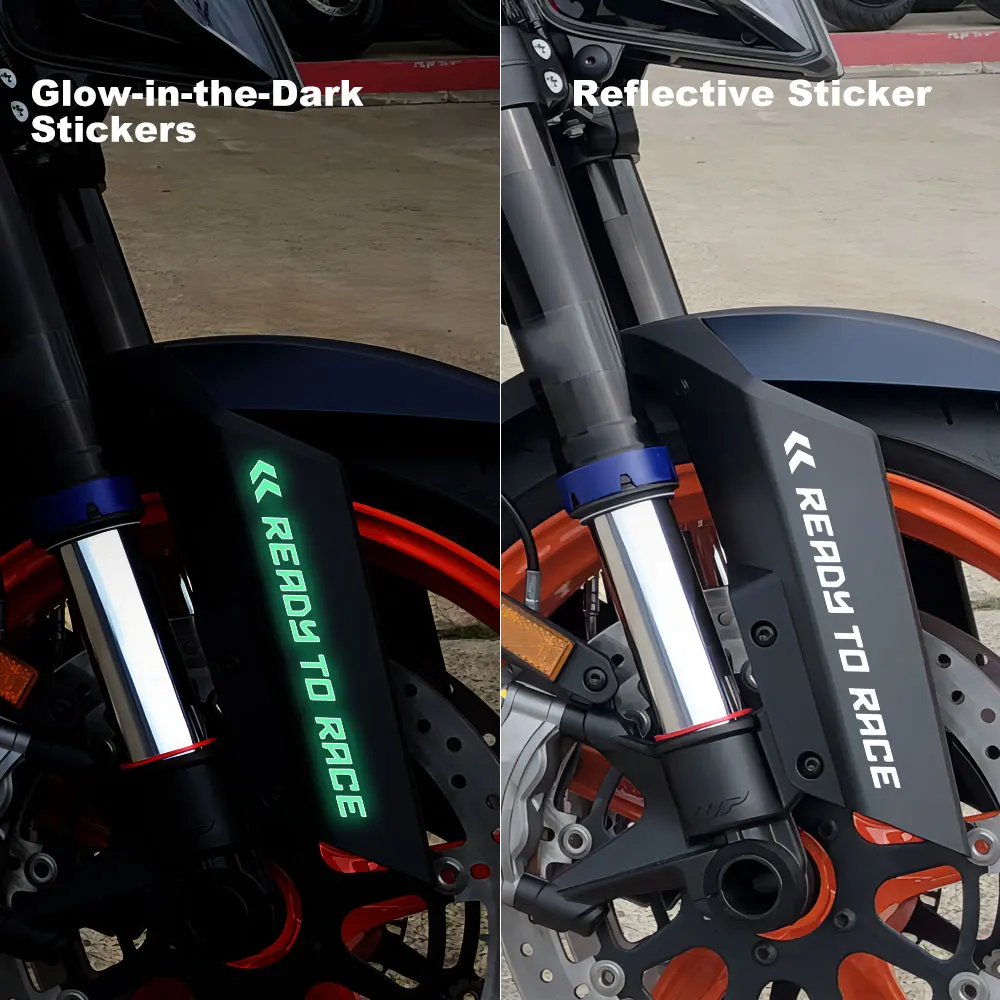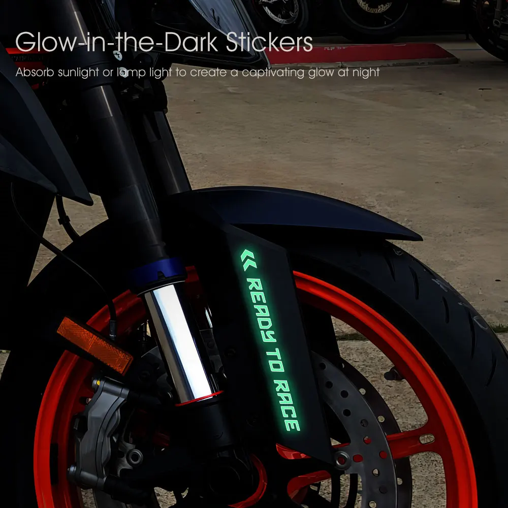 This product is a set of luminescent "READY TO RACE" decals designed to maximize nighttime visibility and style. These specialized stickers are the perfect accessory for motorcycle and sportbike riders who want a dynamic, aggressive look that glows in low-light conditions.