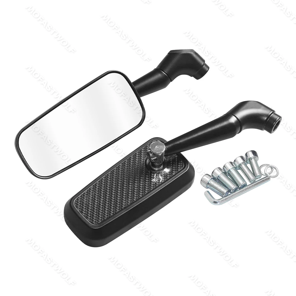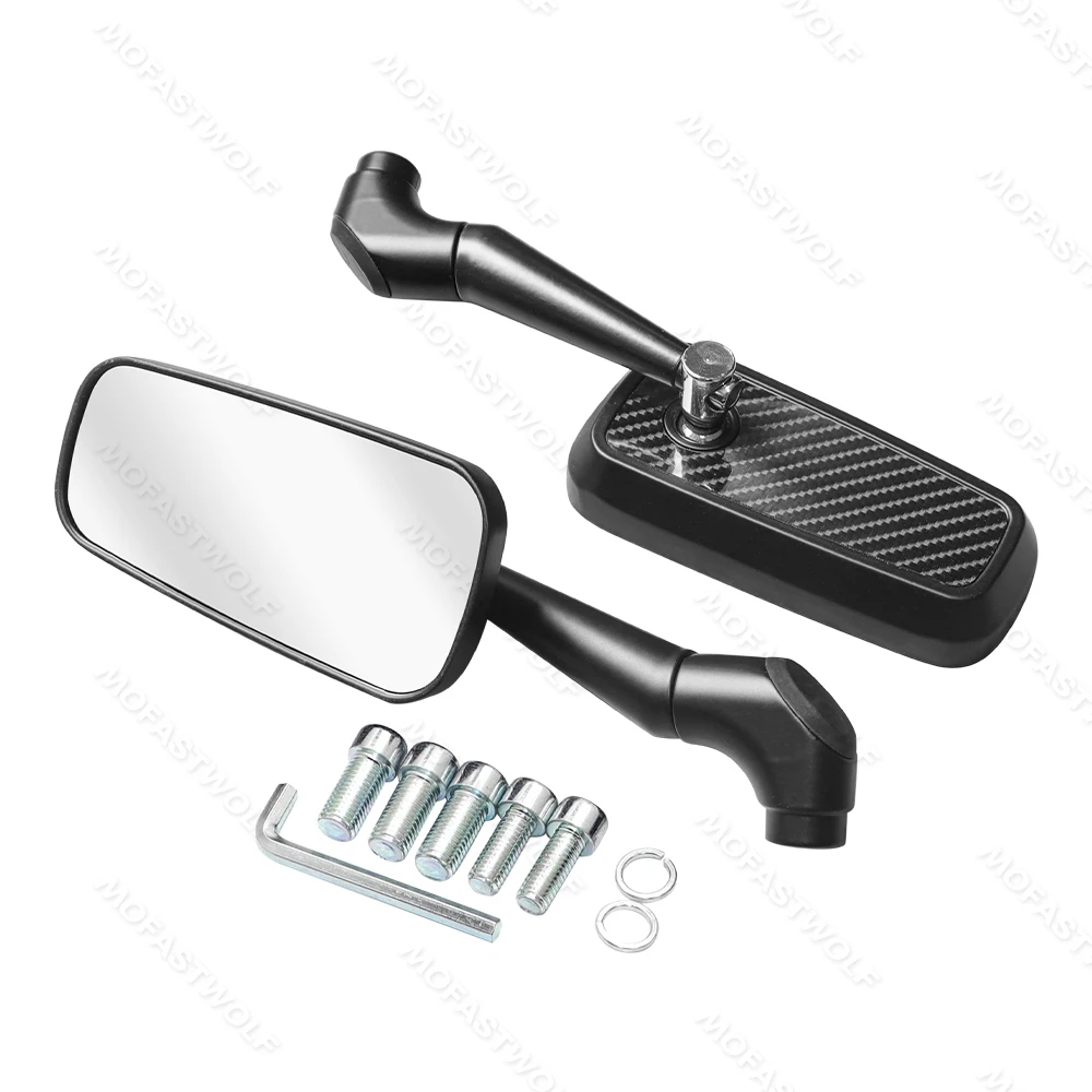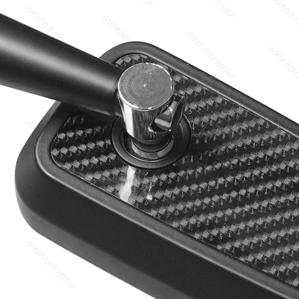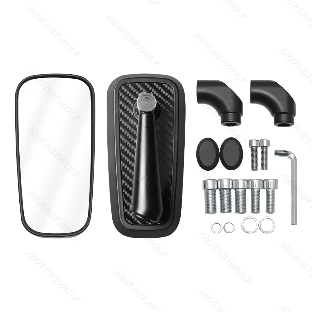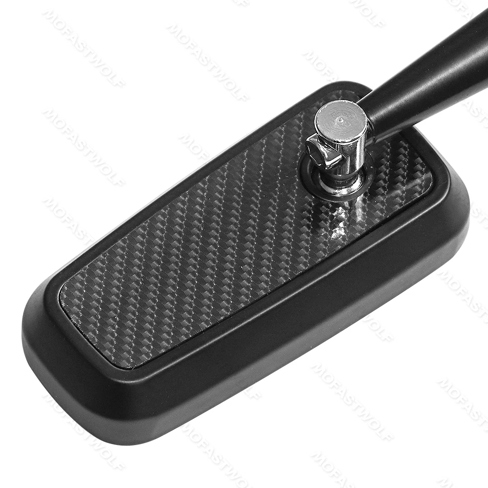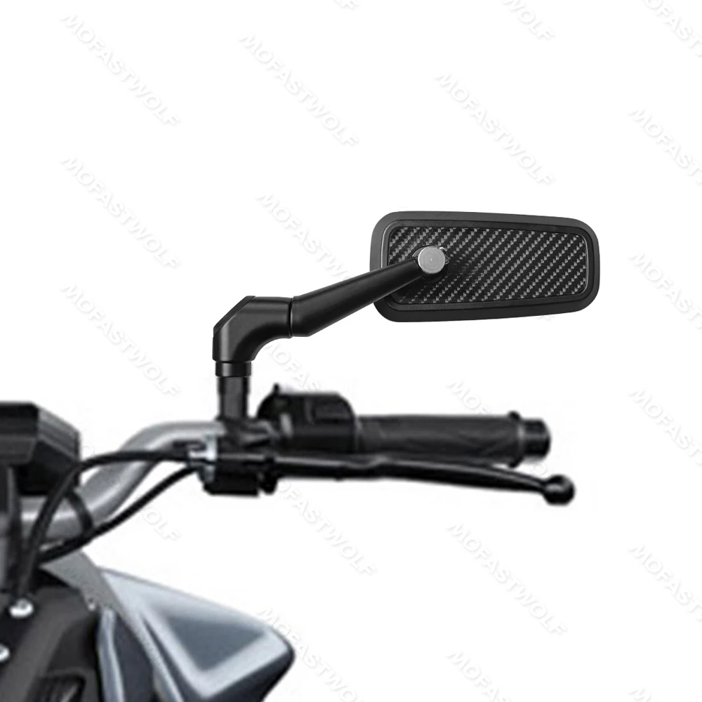 Design & Graphic: Features a classic rectangular mirror head with a technical carbon fiber pattern on the reverse side. The sleek, angular arms provide a modern silhouette that complements adventure, street, and naked bike styles.