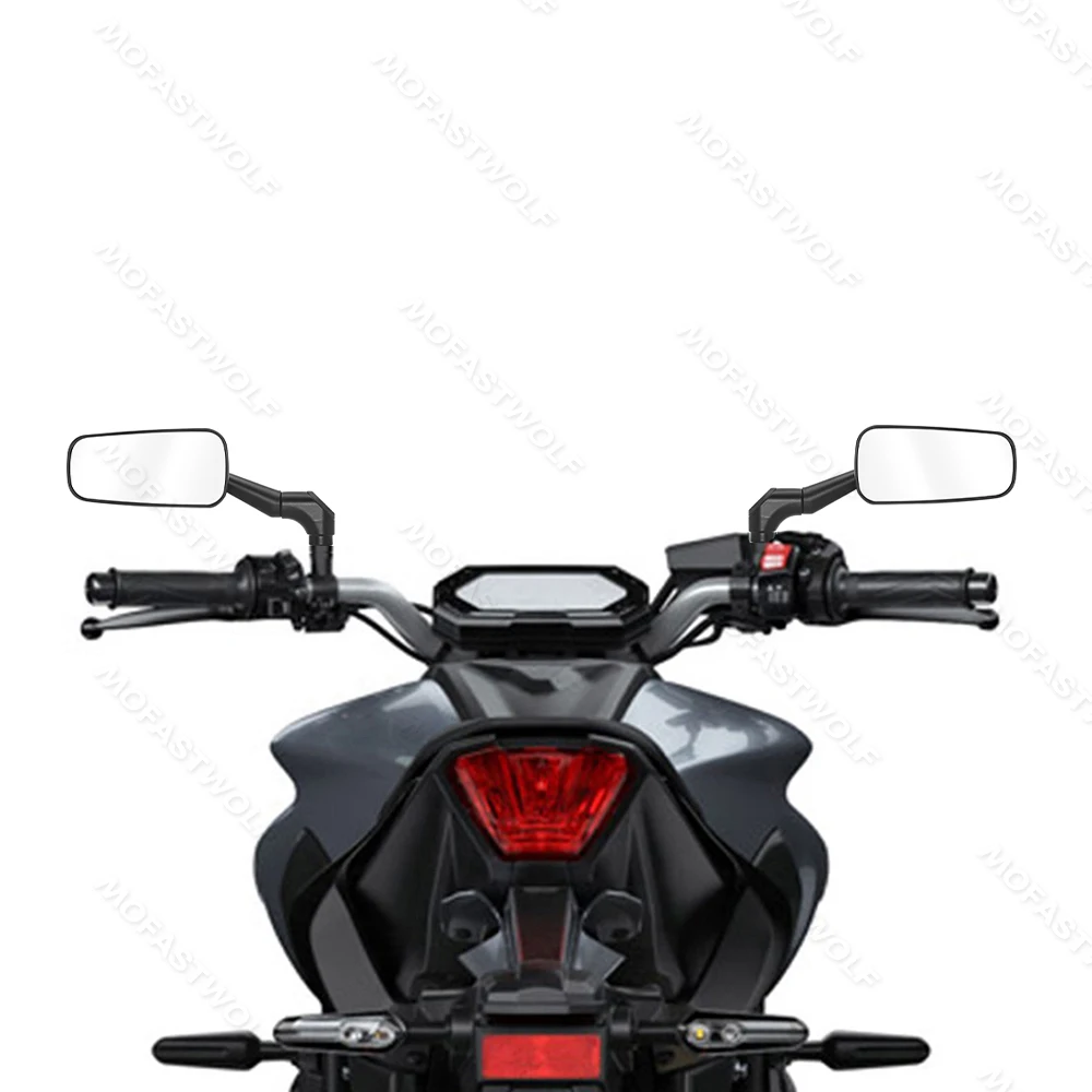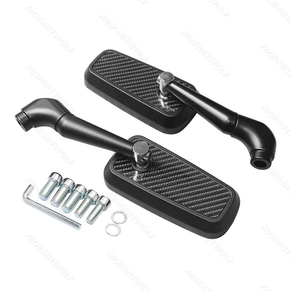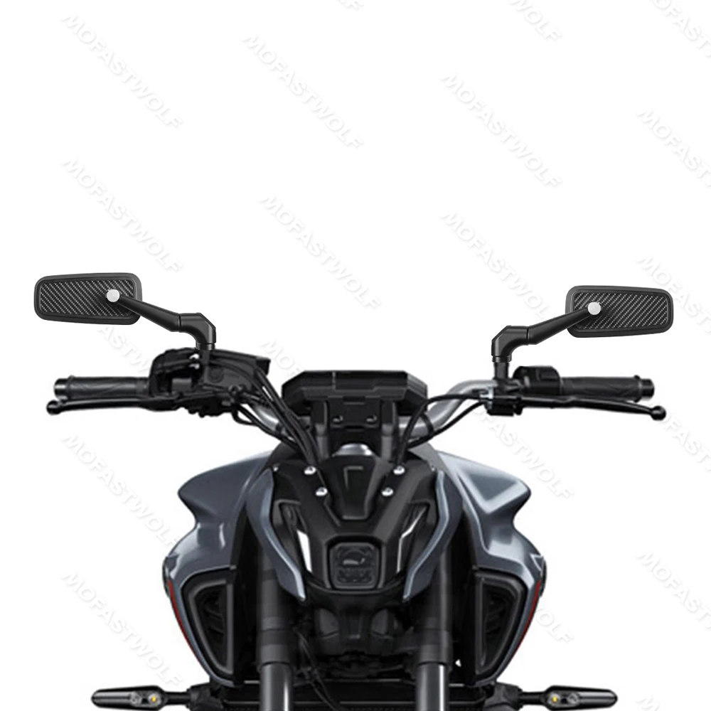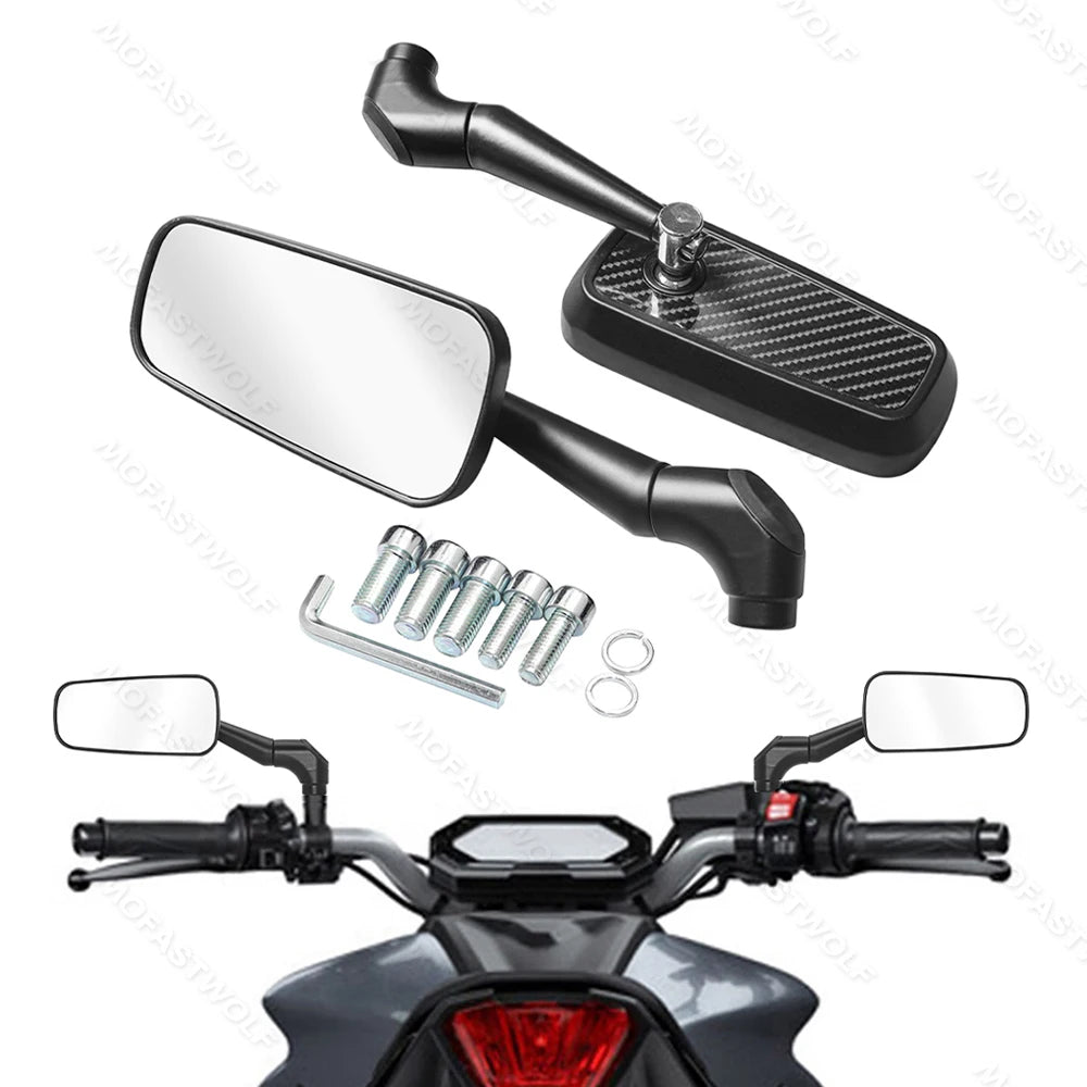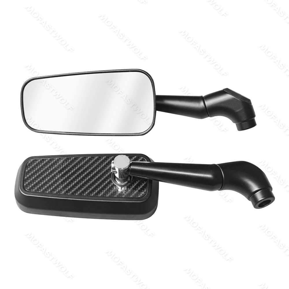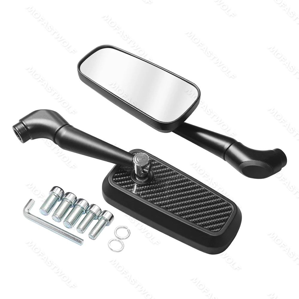 Design & Graphic: Features a classic rectangular mirror head with a technical carbon fiber pattern on the reverse side. The sleek, angular arms provide a modern silhouette that complements adventure, street, and naked bike styles.