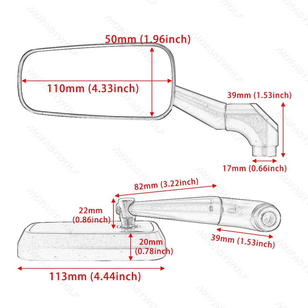 Application: Specifically designed as a universal rearview solution for adventure bikes, cruisers, and standard motorcycles. The generous mirror dimensions ($110\text{mm} \times 50\text{mm}$) provide an expansive view of the road behind.