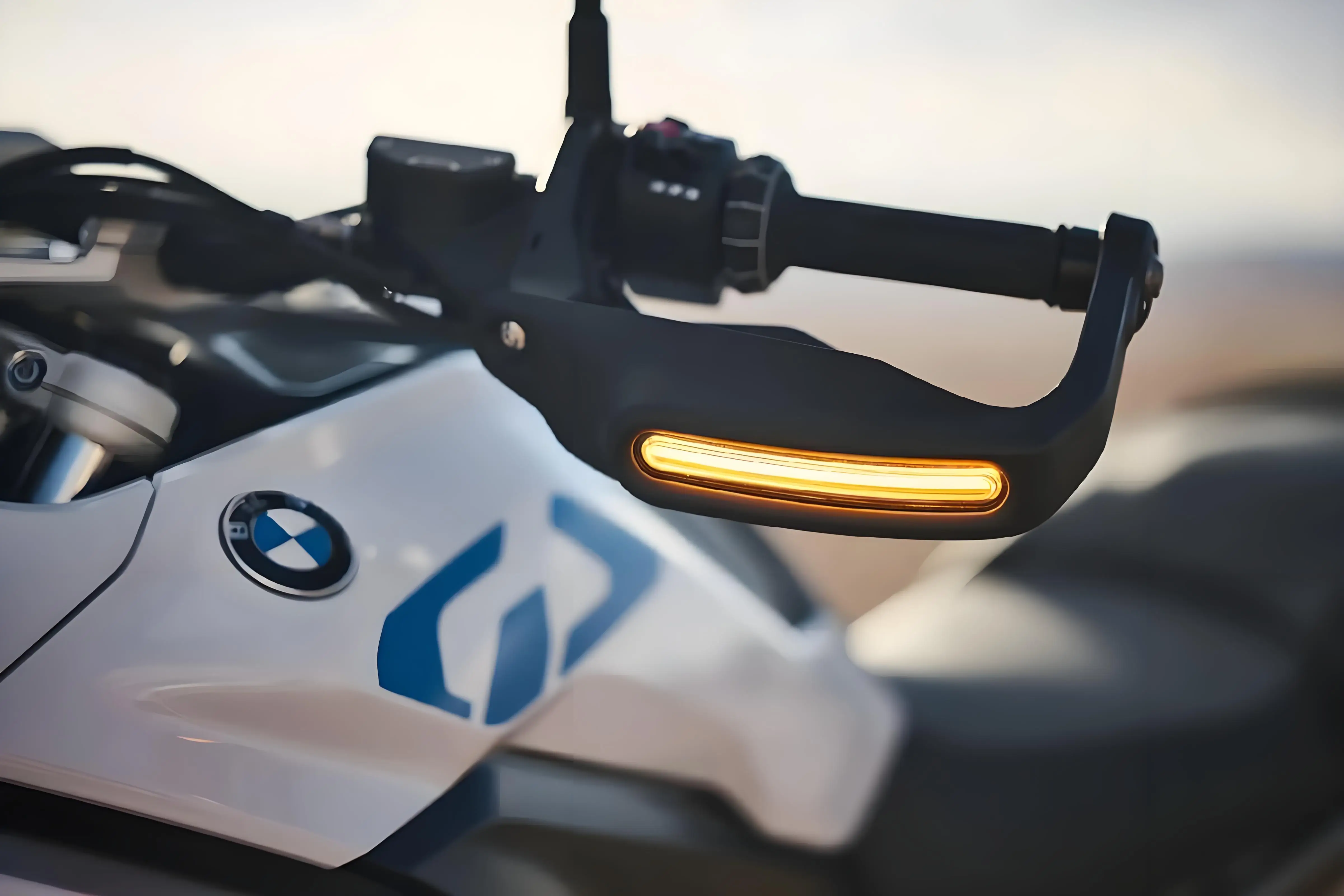 Design & Graphic: Features a modern, curved light bar design that follows the aerodynamic profile of motorcycle handguards. The LEDs transition from a sleek white running light to a vibrant amber sequential signal when activated.