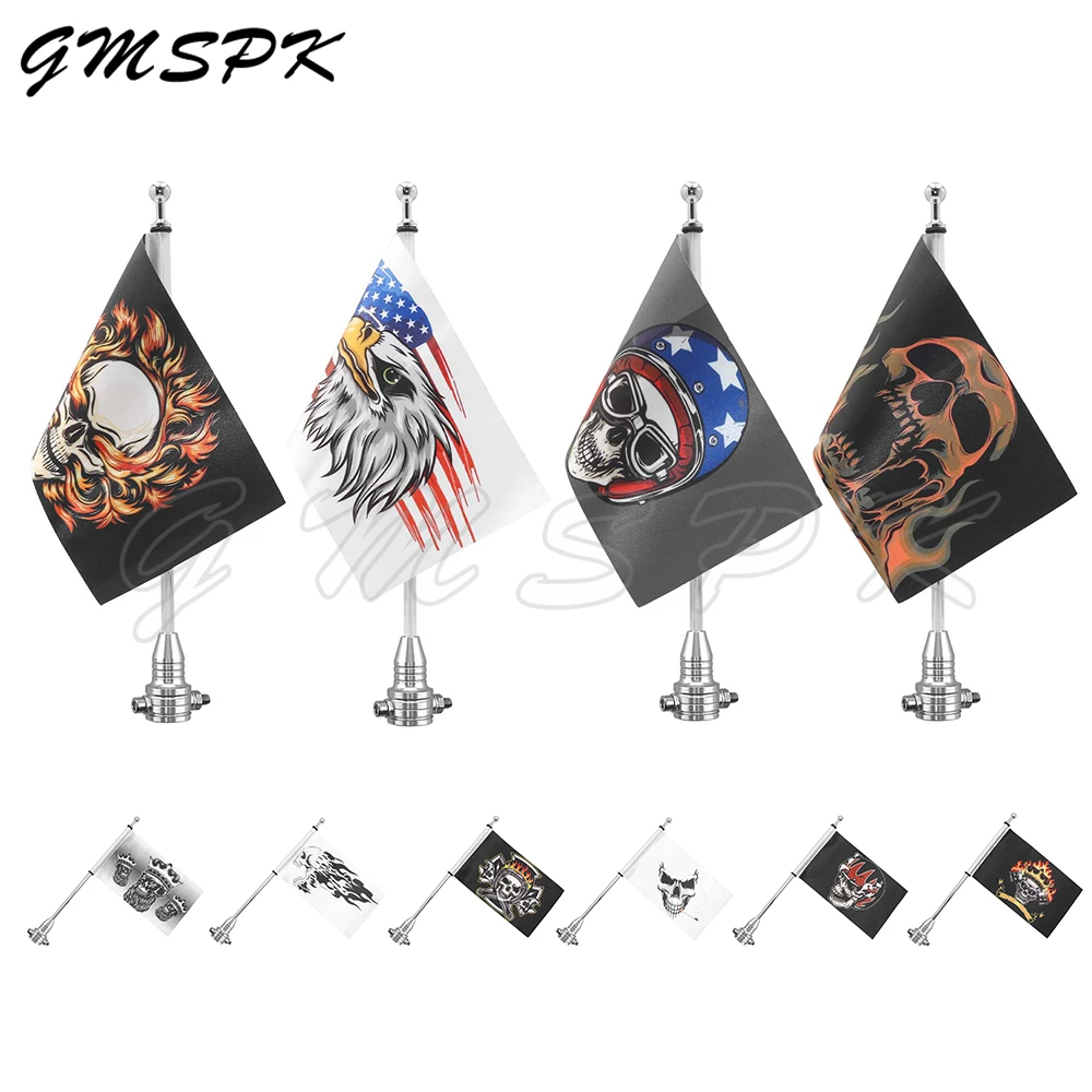 Design & Graphic: Features a classic vertical flag pole design with a variety of bold graphic options, including American eagles, skulls, and fire-themed motifs. The flags are available in multiple background colors such as black, white, and grey to complement any motorcycle's paint scheme.