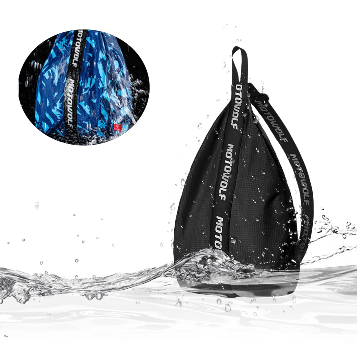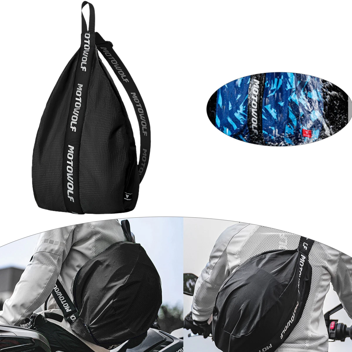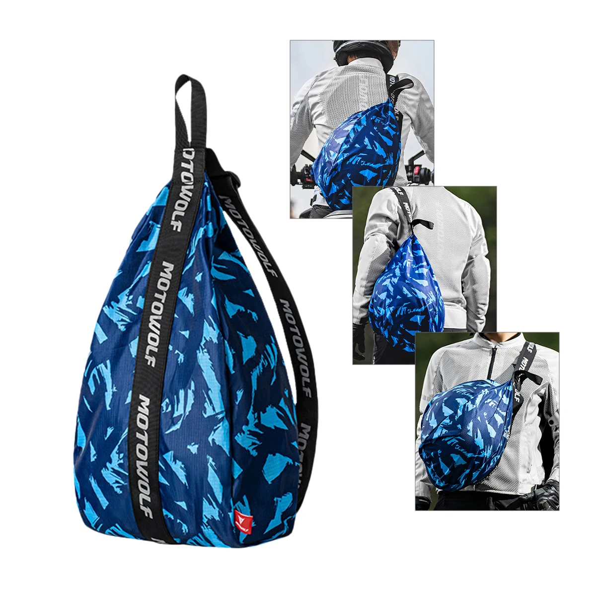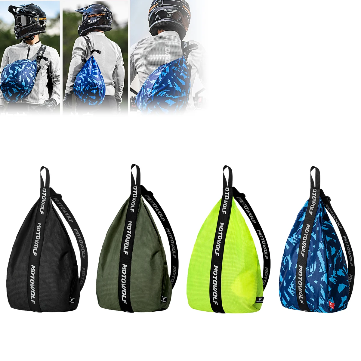 Design & Graphic: Features a unique, teardrop ergonomic shape specifically tailored to cradle a full-face or off-road helmet. The bag includes prominent branded straps and is available in various patterns, including solid black, olive green, and blue camouflage.
