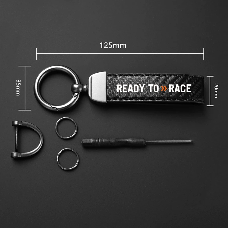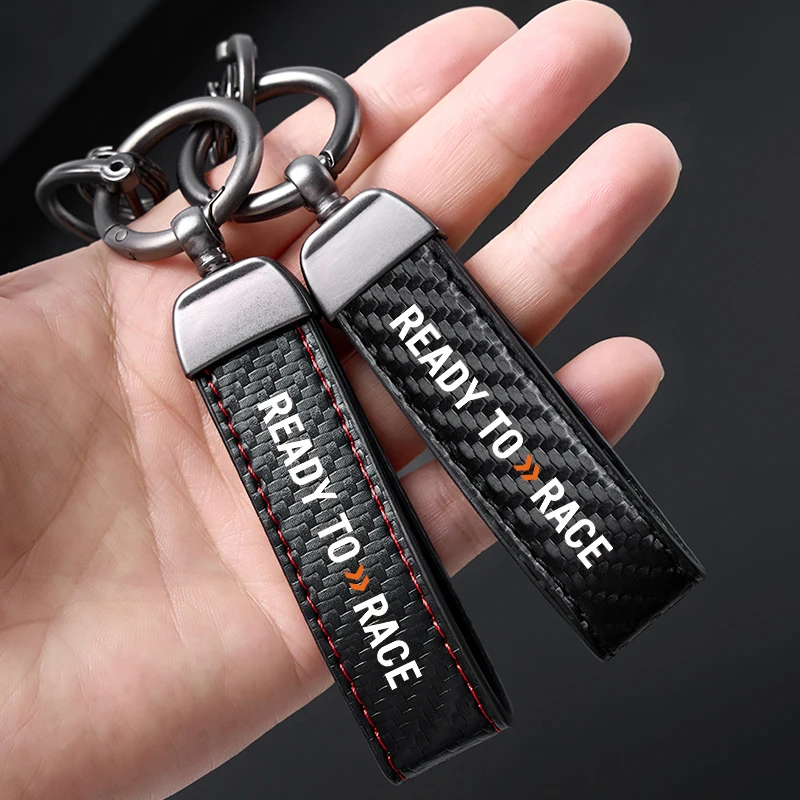 This product is a premium "READY TO RACE" keychain featuring a sophisticated carbon fiber texture and a rugged, industrial design. These high-quality accessories are the perfect choice for motorcyclists and racing enthusiasts who want a durable and stylish way to organize their keys while showcasing their passion for speed.